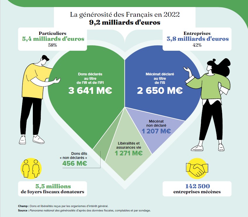 Selon le Panorama national des générosités 2024, réalisé par France générosités en collaboration avec l’Observatoire Philanthropie & Société de la Fondation de France, le montant des dons des particuliers et ceux des entreprises au profit des organisations d’intérêt général est estimé à 9,2 milliards d’euros en 2022. Cette générosité se répartit comme suit :