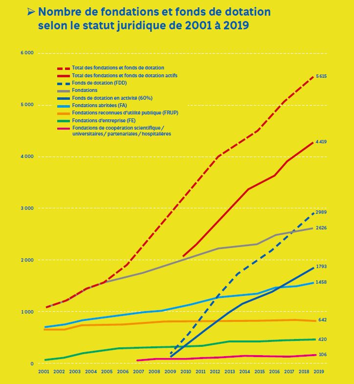 - 2 600 fondations en activité durant l’année 2019, soit 40 % de l’ensemble des fondations existants