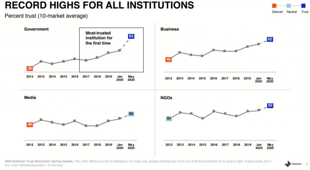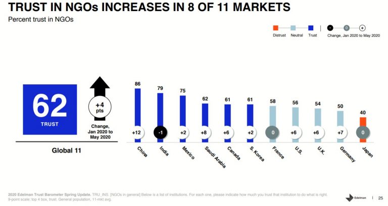L’agence Edelman vient de sortir une mise à jour de son baromètre de la confiance avec une édition spéciale Covid-19 pour analyser l’impact de cette crise et les évolutions des indices de confiance dans le monde. Les premiers résultats montrent que la confiance dans les ONG a augmenté depuis la dernière édition en Janvier. Cette enquête a été réalisée en ligne en avril sur les niveaux de confiance du public pour le gouvernement, les entreprises, les ONG et les médias. 13 200 personnes ont répondu dans 13 pays différents : Canada, Chine, France, Allemagne, Inde, Japon, Mexique, Arabie saoudite, Corée du Sud, Royaume-Uni et les Etats Unis.