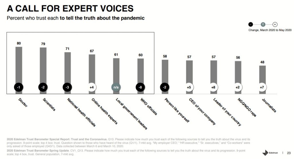 Le baromètre a examiné les domaines d’intervention de la crise du Coronavirus : contenir la pandémie, informer le public, fournir un soutien économique, aider les personnes vulnérables et ramener le pays à la normale. Ils ont alors demandé aux personnes interrogées, quelle institution devait jouer un rôle de premier plan selon eux. Dans ce cadre, la confiance dans les ONG s’est encore démontrée, comme nous pouvons le voir avec les résultats liés aux ONG de cette édition Covid du Baromètre de la confiance d’Edelman :