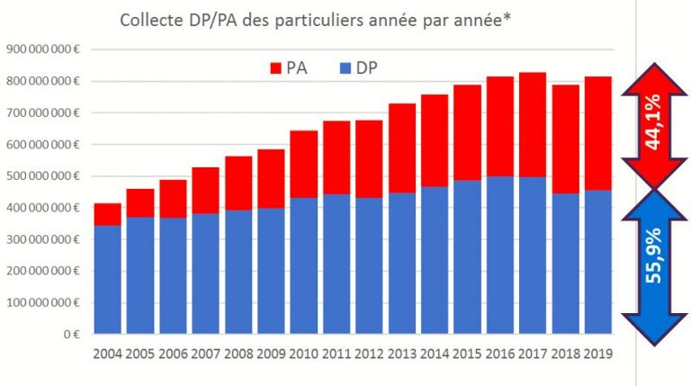 - + 4,9 % des montants de dons en PA en 2019 et + 2,5 % pour la croissance des montants de dons ponctuels (après une baisse de -10% en 2018)