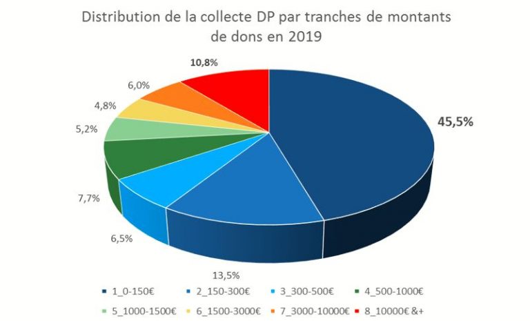 - 10,8 % des montants de dons ponctuels reçus en 2019 sont des dons de plus de 10 000 € contre 8,3% en 2013.