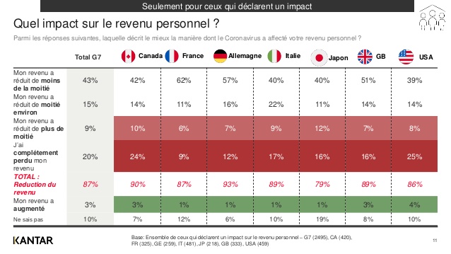 - 72 % (+1) des citoyens au sein des pays du G7 estiment que leur revenu personnel a déjà été impacté ou le sera. En France, cela concernant 69 % (+3) des citoyens, dont 31 % des français qui constatent déjà cette baisse sur leur revenu personnel, plus précisement :