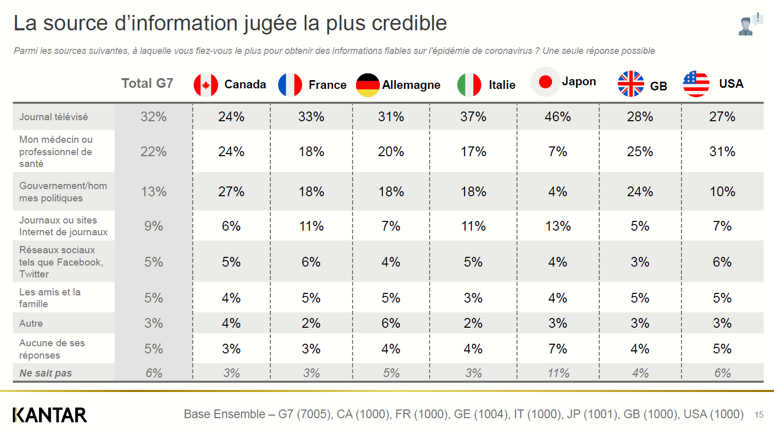 L’étude Covid 19 de Kantar a été réalisée le week-end dernier dans les différents pays du G7 : Canada, France, Italie, Japon, Grande Bretagne et Etats Unis. Elle a permis d’interroger le grand public sur leurs perceptions et leurs comportements face à la crise du Coronavirus. Celle-ci est construite autour de plusieurs thématiques :
