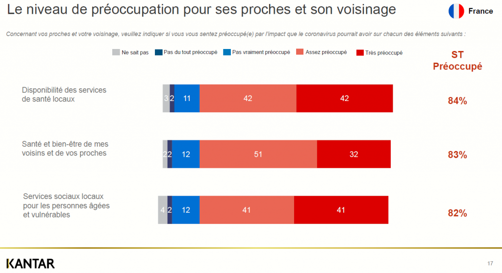 Les français sont ensuite très préoccupés pour leurs proches et leur voisinage, mais selon différents aspects, comme la disponibilité des services de santé locaux (84 %) ou encore sur les services sociaux pour les personnes âgées et vulnérables (82 %).