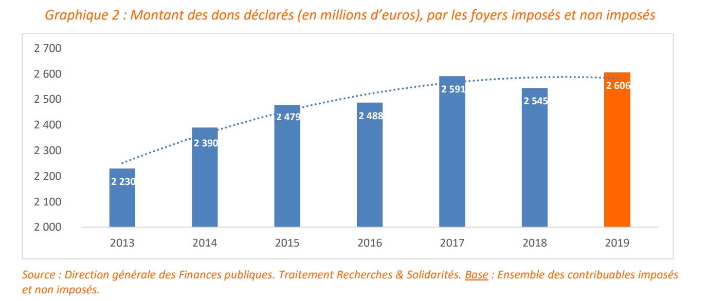 - 2,6 milliards d’euros de dons déclarés en 2019 soit une augmentation de 2,4 %.