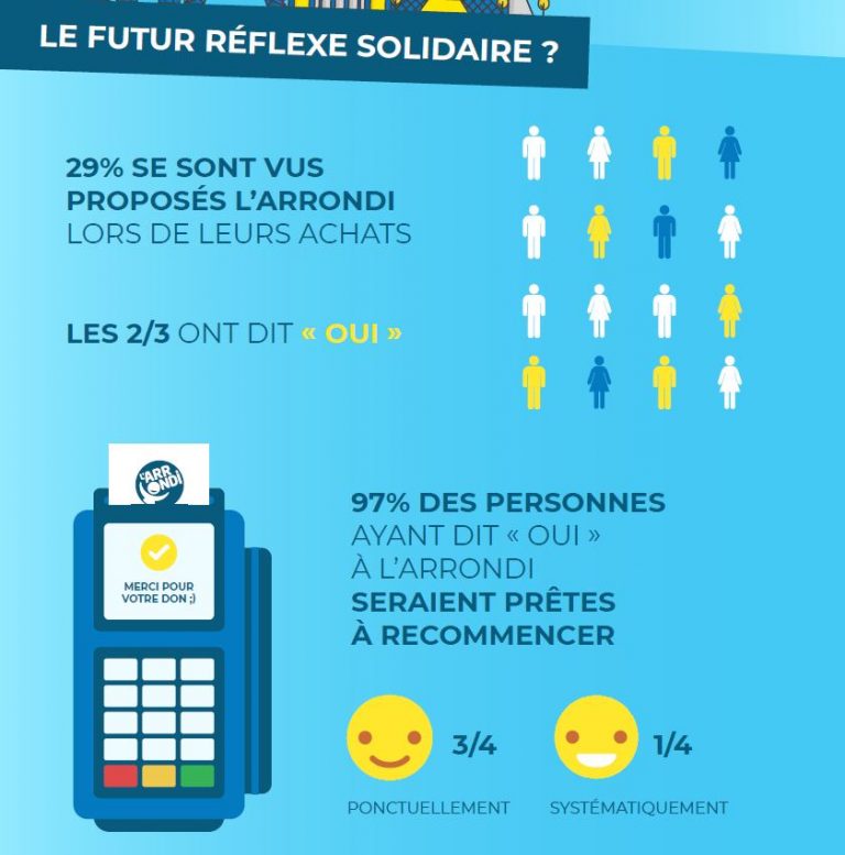 Selon l’étude, 29% des personnes interrogées se sont ainsi vues proposer la démarche en faisant leurs achats, et 2/3 d’entre eux ont accepté de donner par l’arrondi solidaire au profit d’une association ou d’une fondation, ce qui représente près de 10 millions de Français.