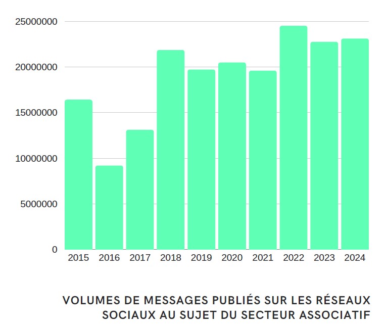 Le secteur associatif démontre une vitalité remarquable sur les réseaux sociaux, avec un engagement qui ne cesse de se renforcer. Propulsé à partir de 2018, l’étude démontre que notre secteur associatif bénéficie d’une visibilité constante, culminant à plus de 23,1 millions de messages publiés en 2024 en lien avec les associations, soit une augmentation de 40% par rapport à 2015. Cette dynamique s’est stabilisée à un niveau élevé depuis 2022, avec un volume annuel oscillant entre 23 et 24 millions de messages, attestant d’un intérêt solide et durable pour les causes associatives dans l’écosystème numérique.